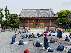 1,2年生は宝仙寺へ歩いていき、本堂や三重塔、鐘など好きなところを一つ選んでクレヨンで描きました。