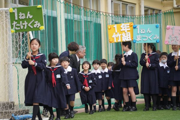 六年生の代表からの歓迎の言葉を、一年生たちは真剣な表情で見つめ、しっかりと耳を傾けていました。